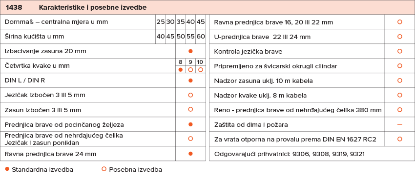 >Wilka ugradbena brava 1438 namijenjena je za vrata s ALU ili metalnim okvirom te je pripremljena za profilni cilindar. Odlikuje je robusno pocinčano kućište, jednodijelna četvrtka kvake i mogućnost djelovanja ključa na zasun jednim okretom.