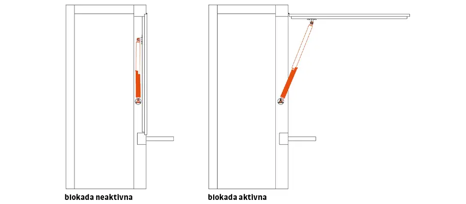 Blokada preprečuje, da bi se vzmet v iztegnjenem stanju nenamerno stisnila. Tako okno, loputa ali pokrov zanesljivo ostanejo v odprtem položaju – tudi ob vetru ali dodatnih obremenitvah.